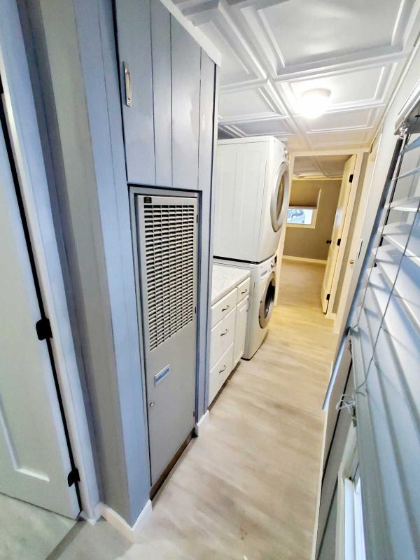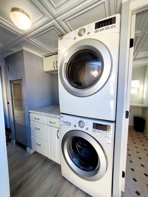 The laundry area has newer LG stacked washer and dryer with a work area for folding clothes and multiple cabinets for storage.