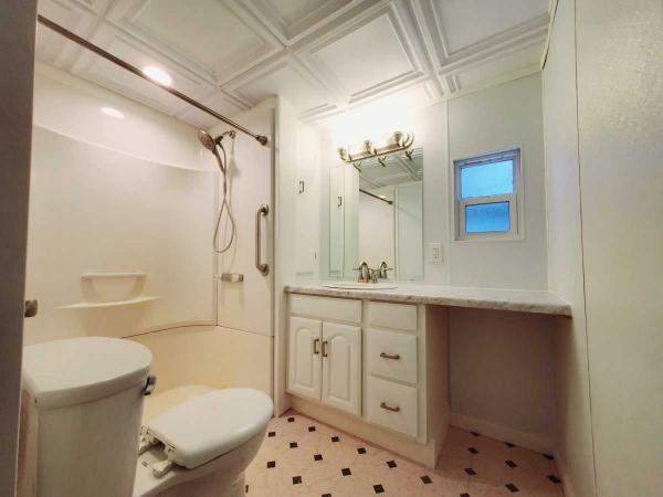 The bathroom has an ample step-in shower with safety handle and an overhead light. A long bathroom countertop, vanity, and large side cabinet provide lots of storage space.